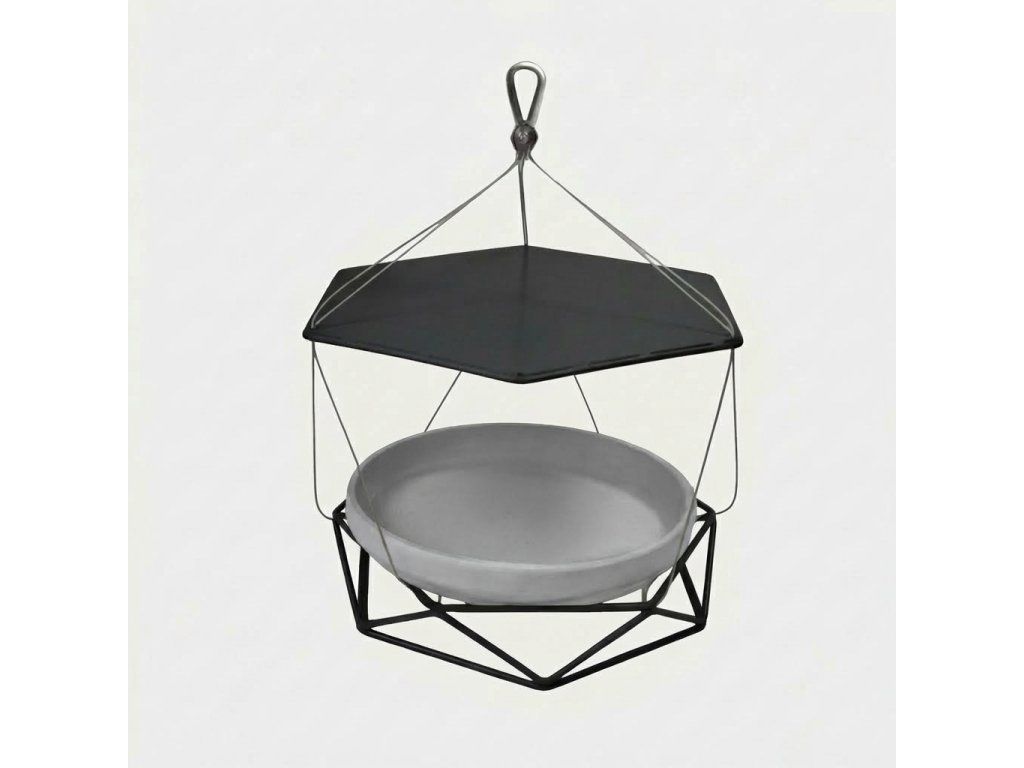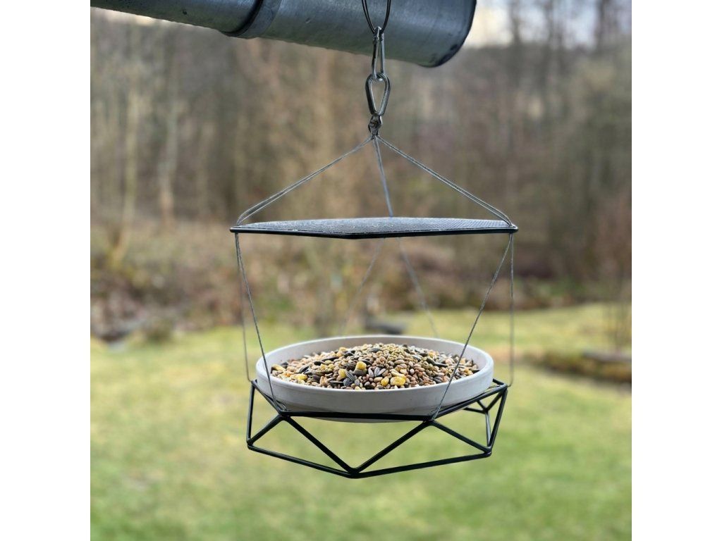Závěsné krmítko z ohýbaného ocelového drátu s hliněnou miskou. Robustní konstrukce ošetřená práškovým lakem odolá mrazu, dešti i letnímu slunci. V zimě nasypte zrní, v létě naplňte vodou.